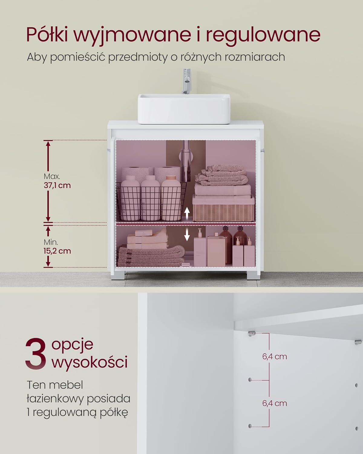 ❤️ Regulacja wysokości – wewnętrzną półkę można ustawić na 3 poziomach, aby zmieścić zarówno małe kosmetyki, jak i wysokie butelki szamponu.