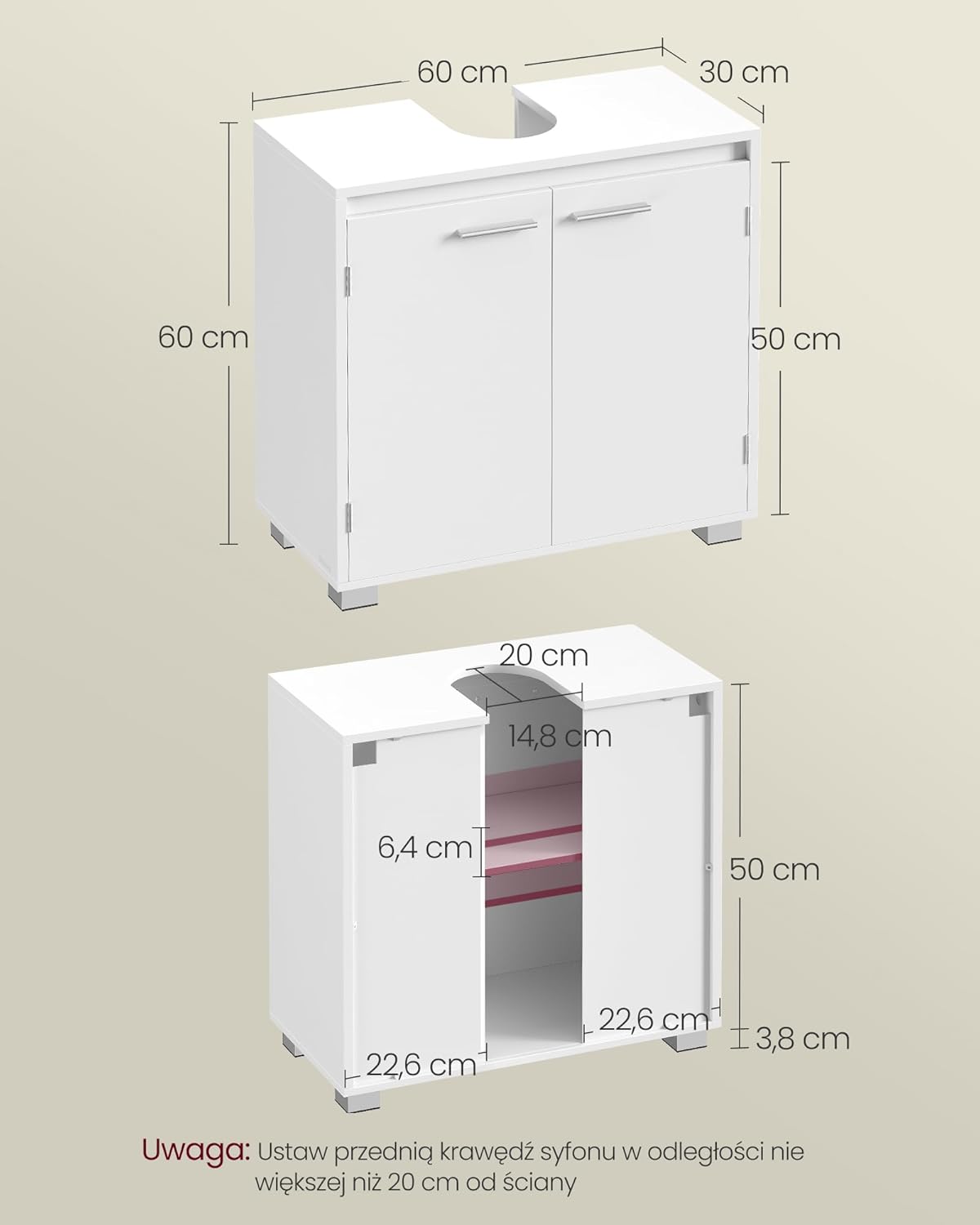 ❤️ Pasuje do umywalek bez kolumny – upewnij się, że wymiary wycięcia na syfon (20 × 14,8 cm) odpowiadają Twojej instalacji.