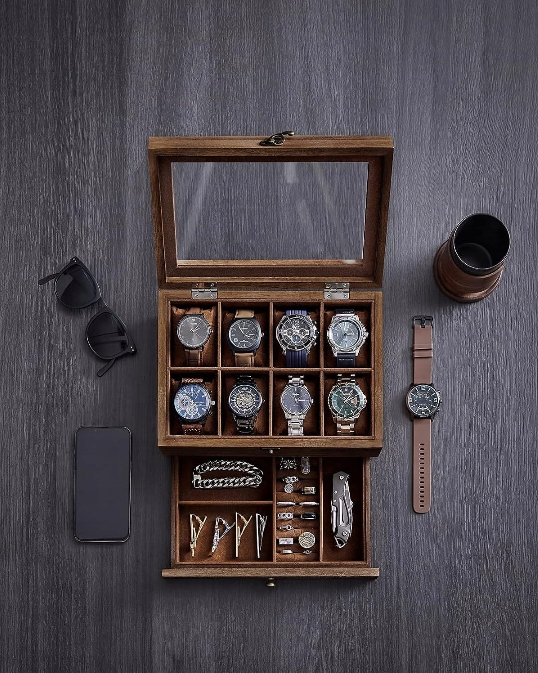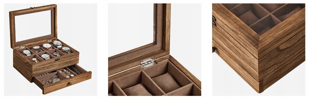 Górna część oferuje 8 miękkich przegródek z poduszkami na zegarki – zarówno sportowe, jak i eleganckie modele znajdą tu idealne warunki do przechowywania. Wysuwana dolna szuflada pozwala uporządkować pierścionki, kolczyki czy inne drobne akcesoria, zachowując przy tym estetykę i wygodę użytkowania.