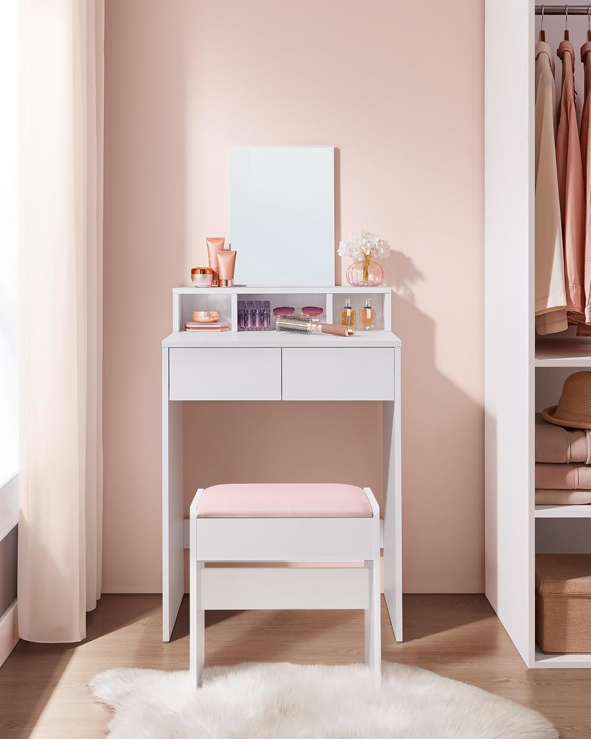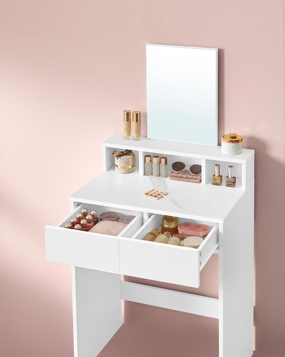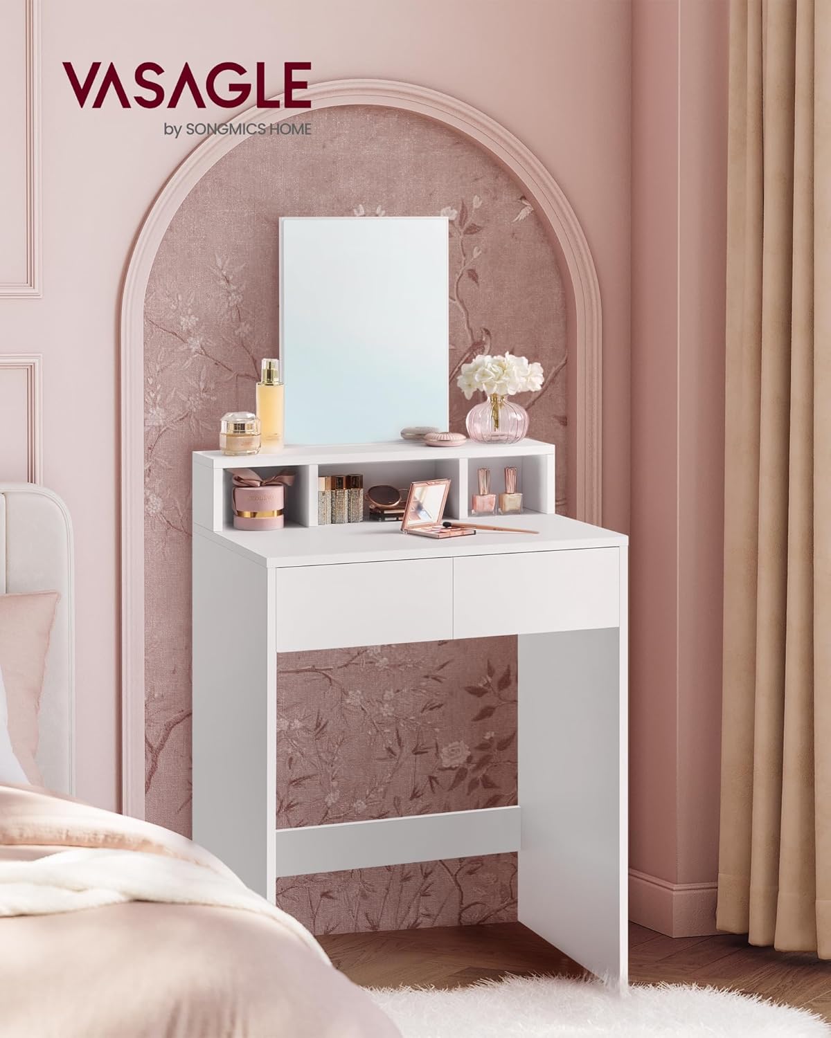 Elegancka i kompaktowa toaletka VASAGLE to idealne rozwiązanie do małych sypialni i garderób. Dzięki praktycznym szufladom, otwartym przegródkom oraz dużemu blatowi wszystkie kosmetyki, akcesoria i biżuteria znajdą swoje miejsce. Prosty, nowoczesny design świetnie wpasuje się w każde wnętrze.