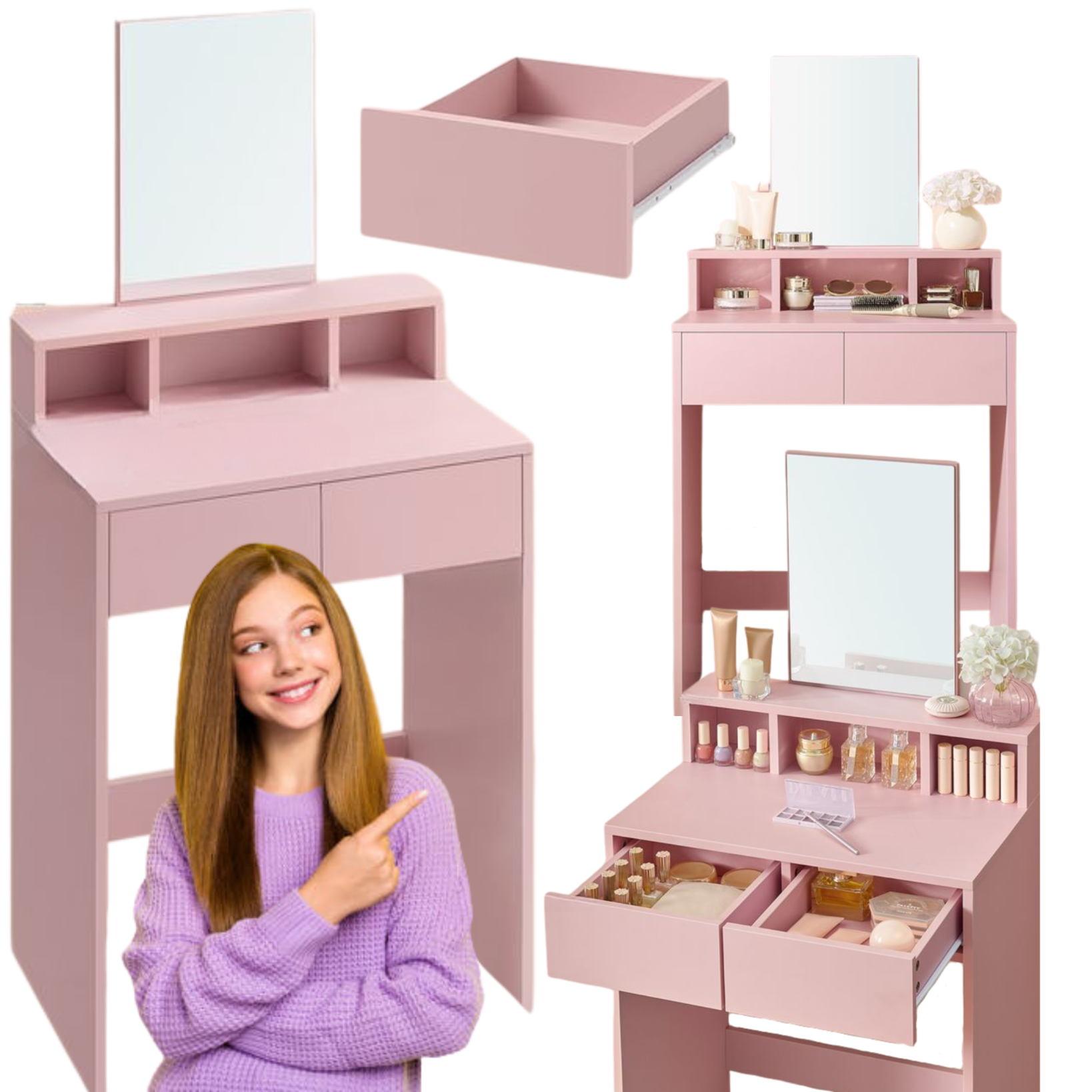 Mała Toaletka RÓŻOWA z Lustrem Stolik Kosmetyczny Szafka z Szufladami Półki
