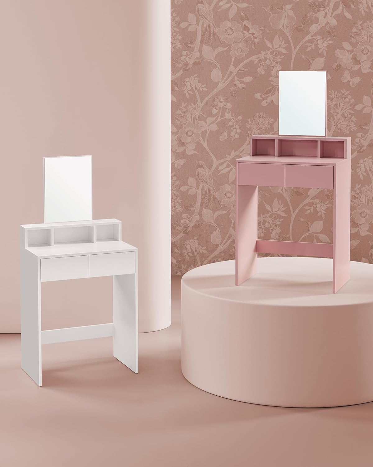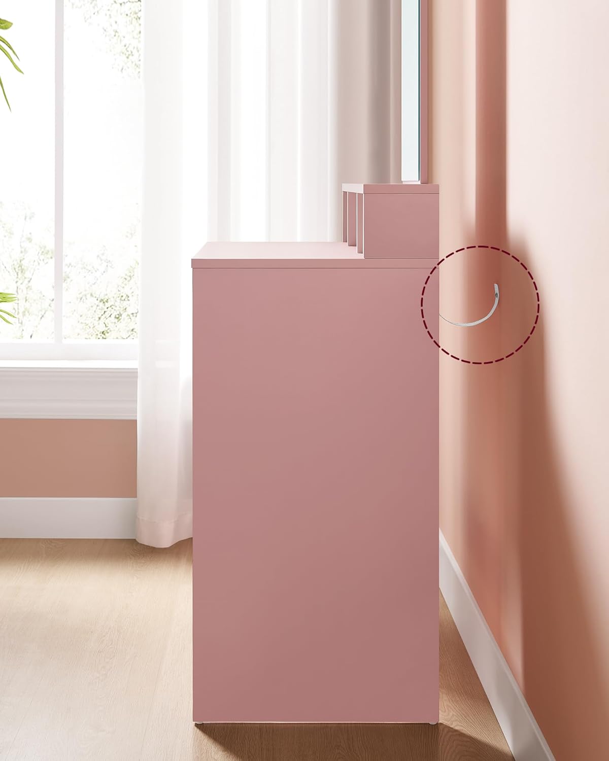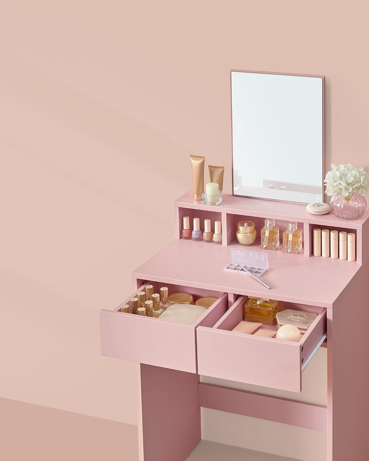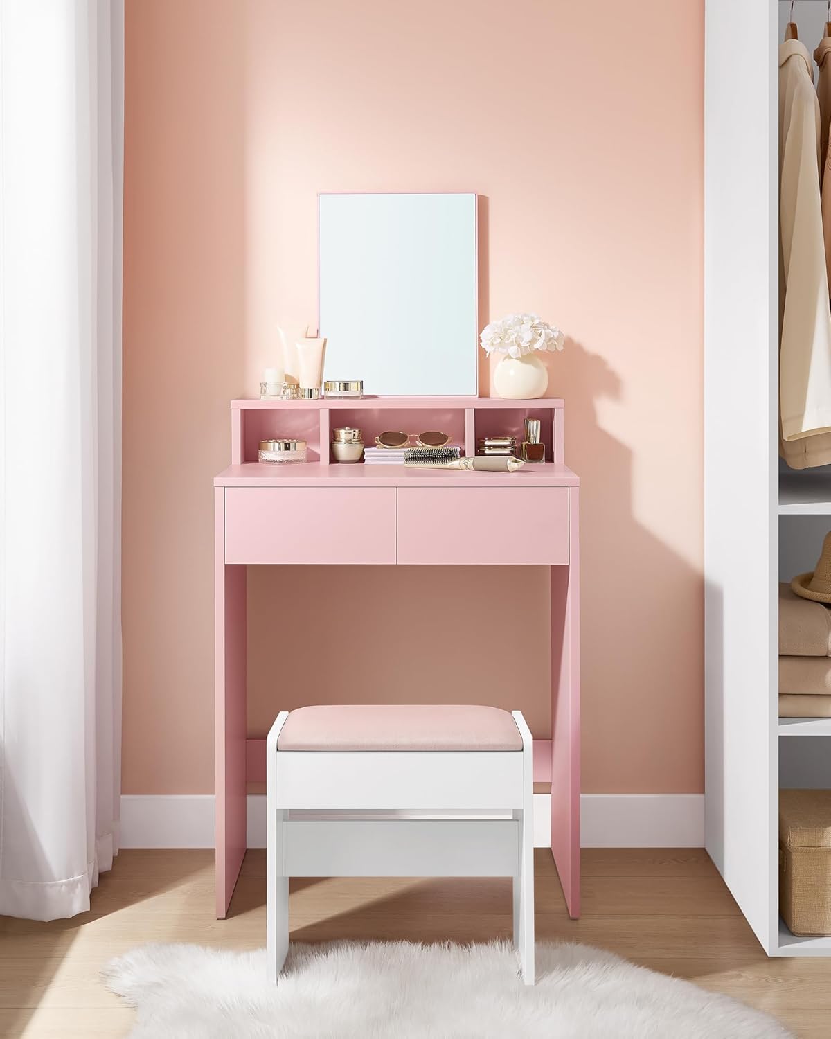 Elegancka i kompaktowa toaletka VASAGLE to idealne rozwiązanie do małych pomieszczeń. Dzięki przemyślanej konstrukcji oferuje wystarczającą ilość miejsca na kosmetyki, a nowoczesny design w pastelowym różu wprowadza subtelny akcent do Twojej sypialni.