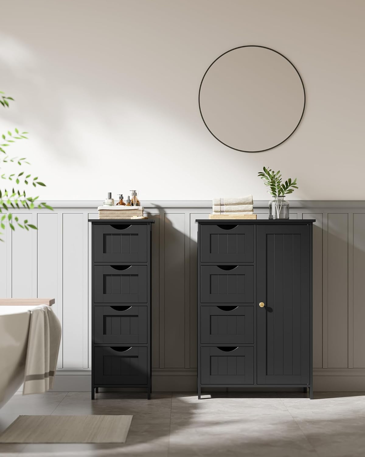 Nowoczesna i kompaktowa szafka łazienkowa VASAGLE w kolorze czarny atrament łączy elegancki, minimalistyczny design z funkcjonalnym miejscem do przechowywania. Cztery pojemne szuflady pomieszczą ręczniki, kosmetyki i drobiazgi, a możliwość przymocowania do ściany zapewnia stabilność i bezpieczeństwo.