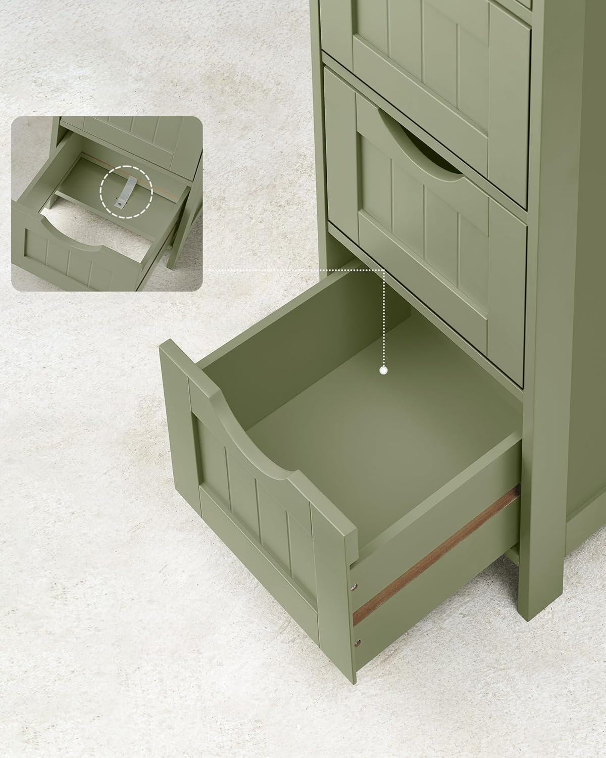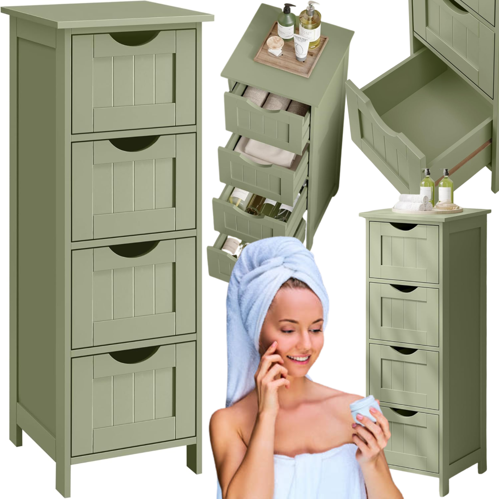 Pojemna i kompaktowa szafka łazienkowa VASAGLE w kolorze laur zielony łączy nowoczesny design z praktycznym przechowywaniem. Dzięki 4 szufladom pomieścisz ręczniki, kosmetyki i drobiazgi, a możliwość przymocowania do ściany zapewnia stabilność i bezpieczeństwo.