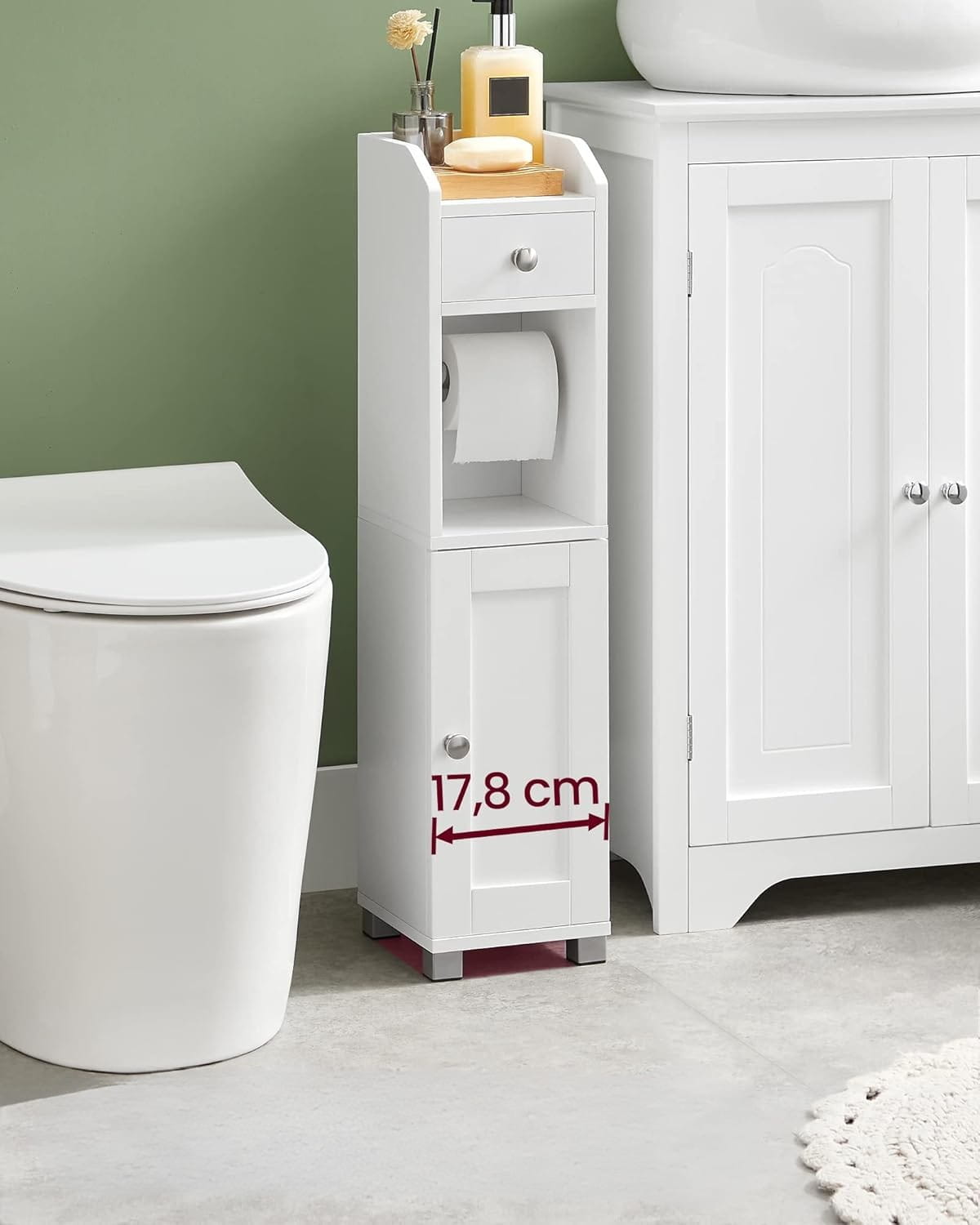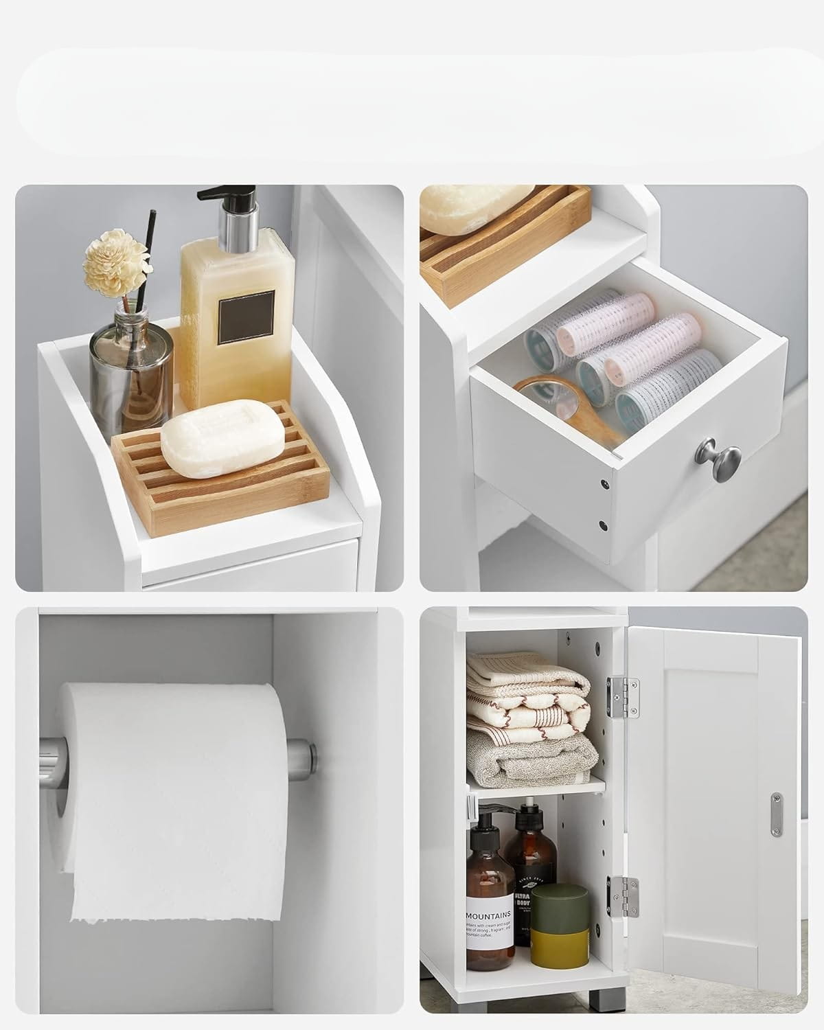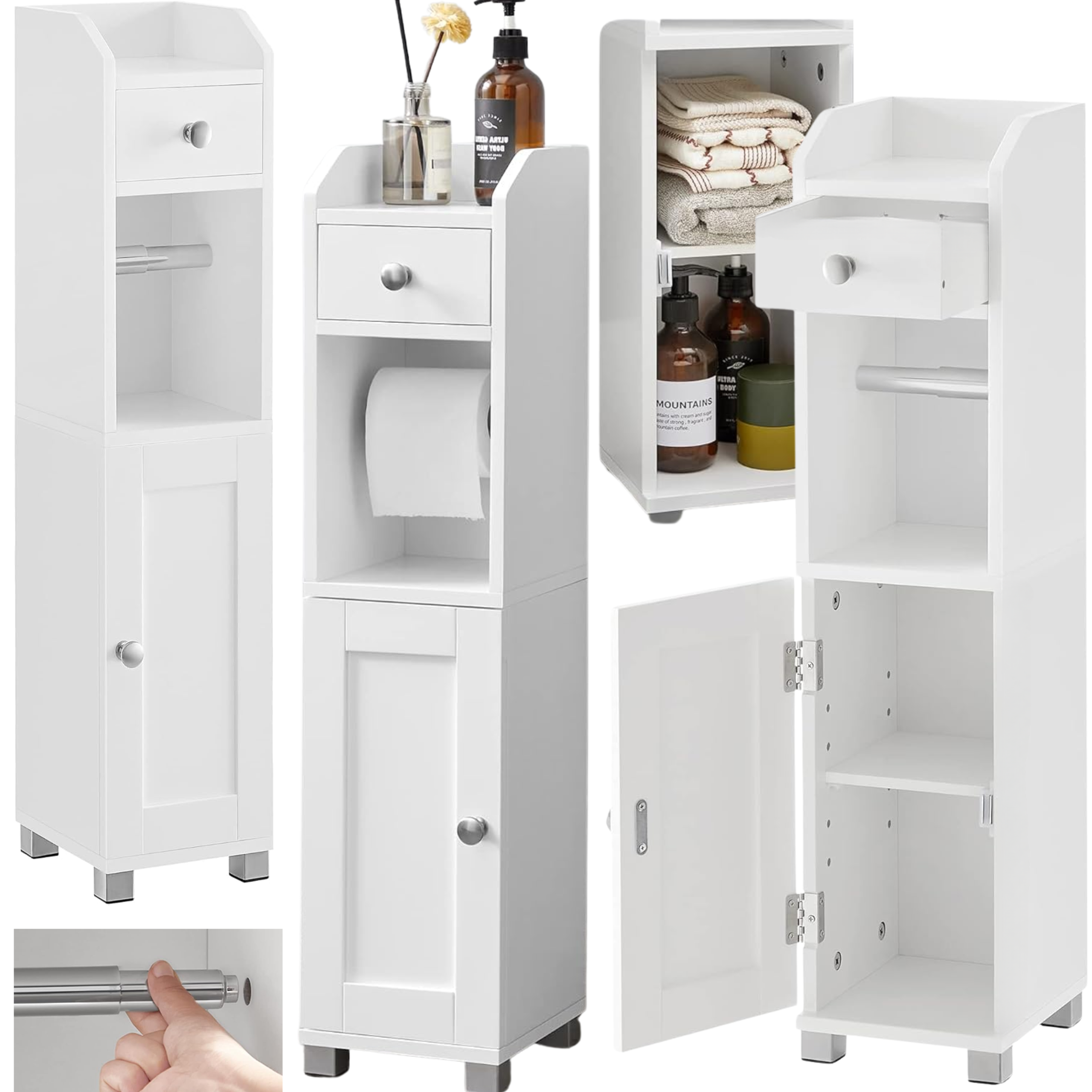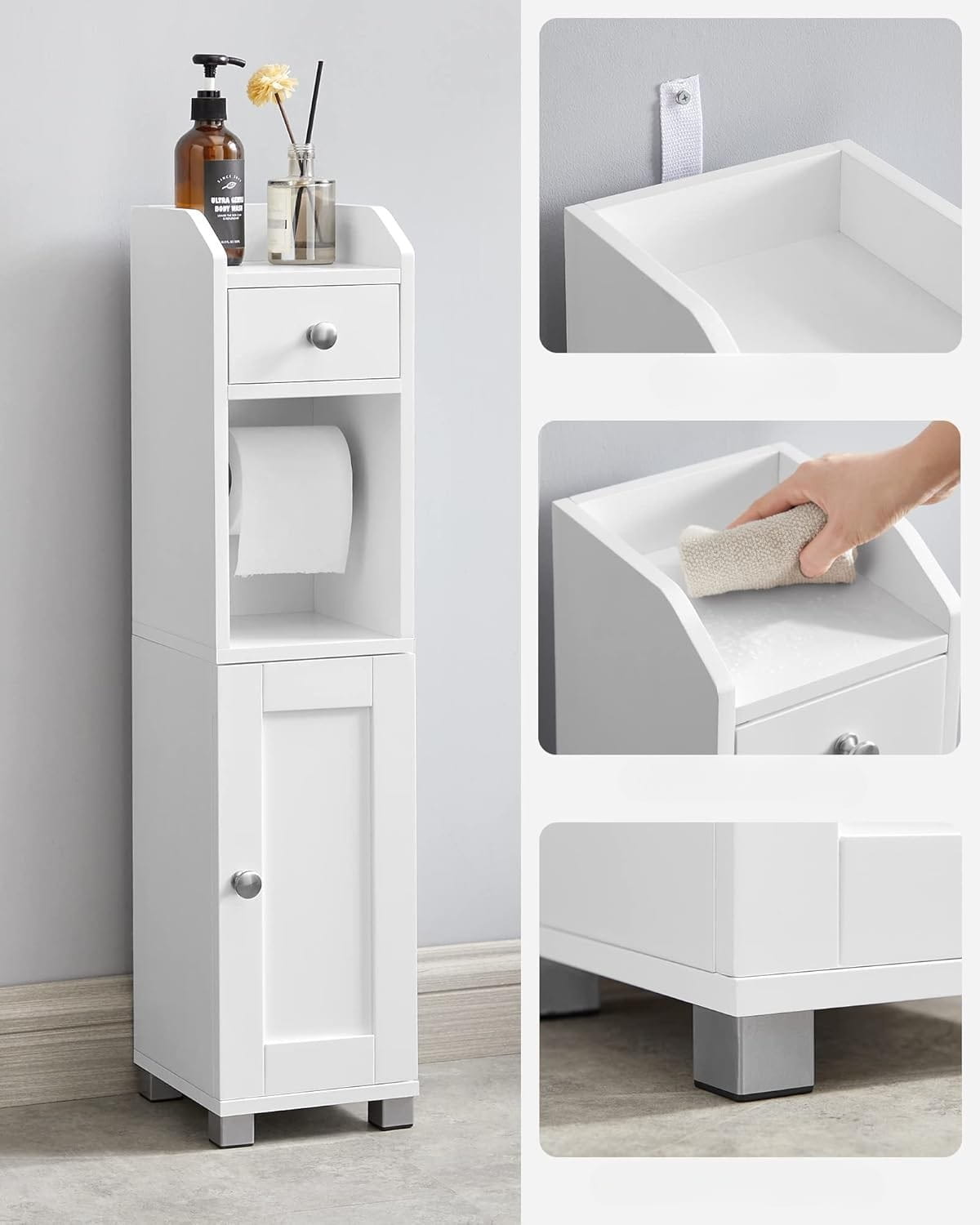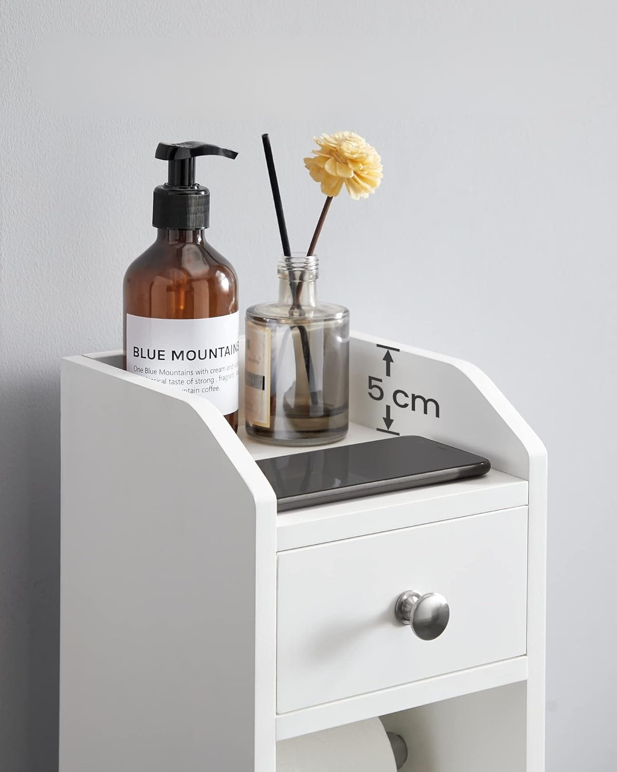❤️ Wielofunkcyjna organizacja – dolna szafka z regulowaną półką, szuflada na drobne przedmioty, uchwyt na papier toaletowy i górna komora na telefon lub roślinę.