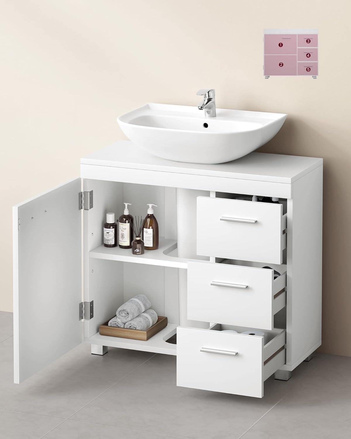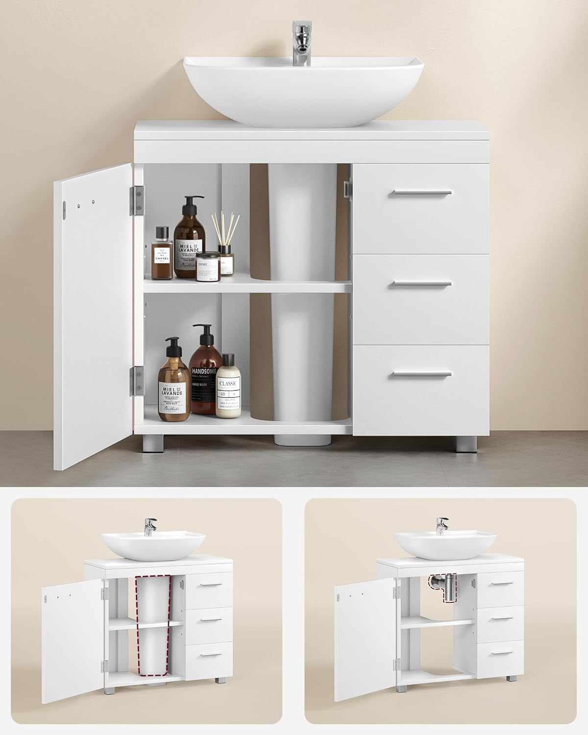 Praktyczna i elegancka szafka pod zlew od VASAGLE to idealne rozwiązanie, by wykorzystać przestrzeń w łazience i utrzymać porządek. Dzięki 3 bocznym szufladom i 2 przegródkom za drzwiami zapewnia miejsce na ręczniki, kosmetyki czy środki czystości. Jej nowoczesny design w chmurowo-białym kolorze doskonale wpasuje się w wystrój każdej łazienki.