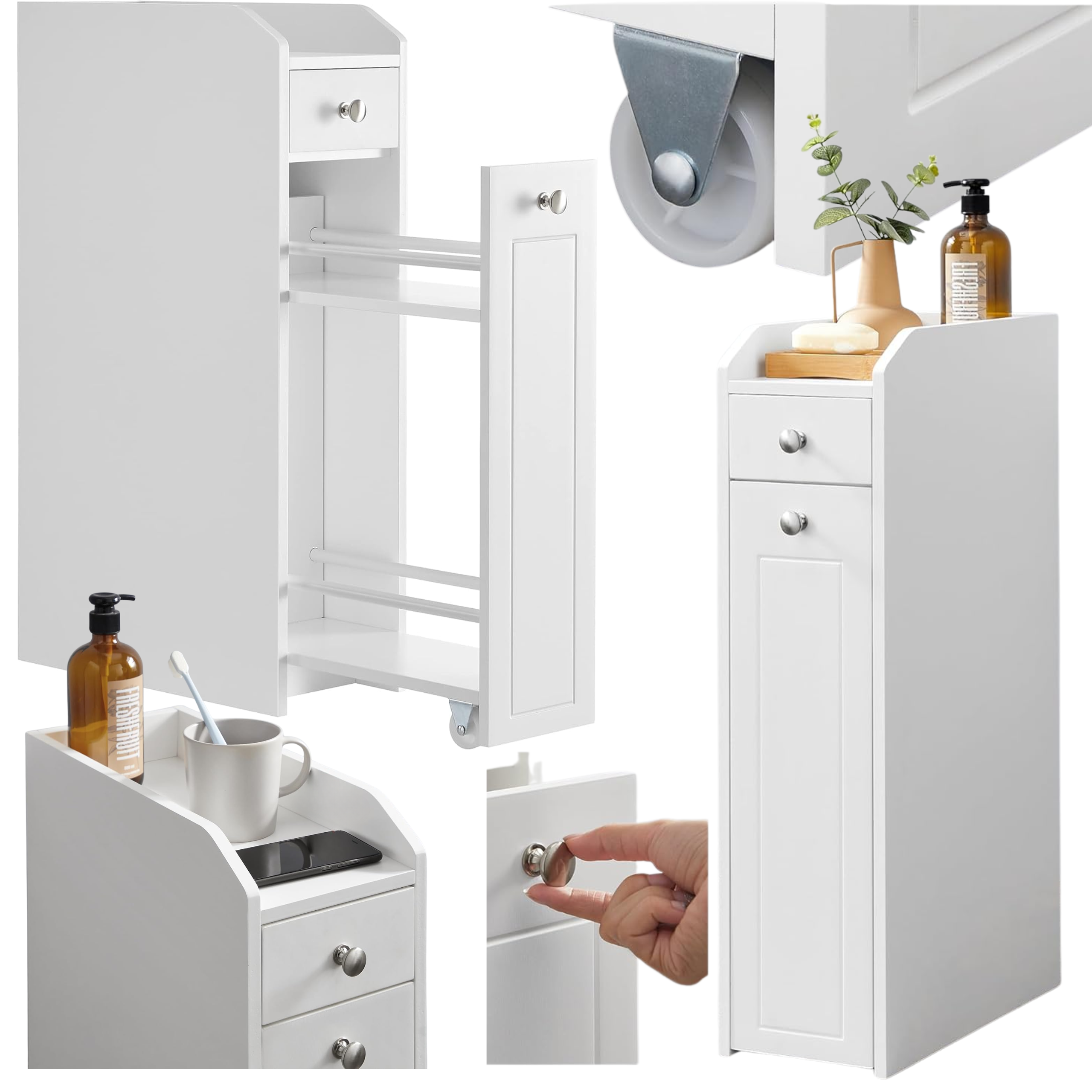 Praktyczna i kompaktowa szafka VASAGLE to idealne rozwiązanie do wąskich łazienek, kuchni lub innych pomieszczeń, gdzie liczy się każdy centymetr. Dzięki 4 poziomom przechowywania, w tym dolnej szufladzie na kółkach, górnej szufladzie i otwartej półce, wszystkie akcesoria, papier toaletowy i drobiazgi znajdą swoje miejsce. Minimalistyczny, biały design pasuje do każdego wnętrza i dodaje świeżego, nowoczesnego charakteru.