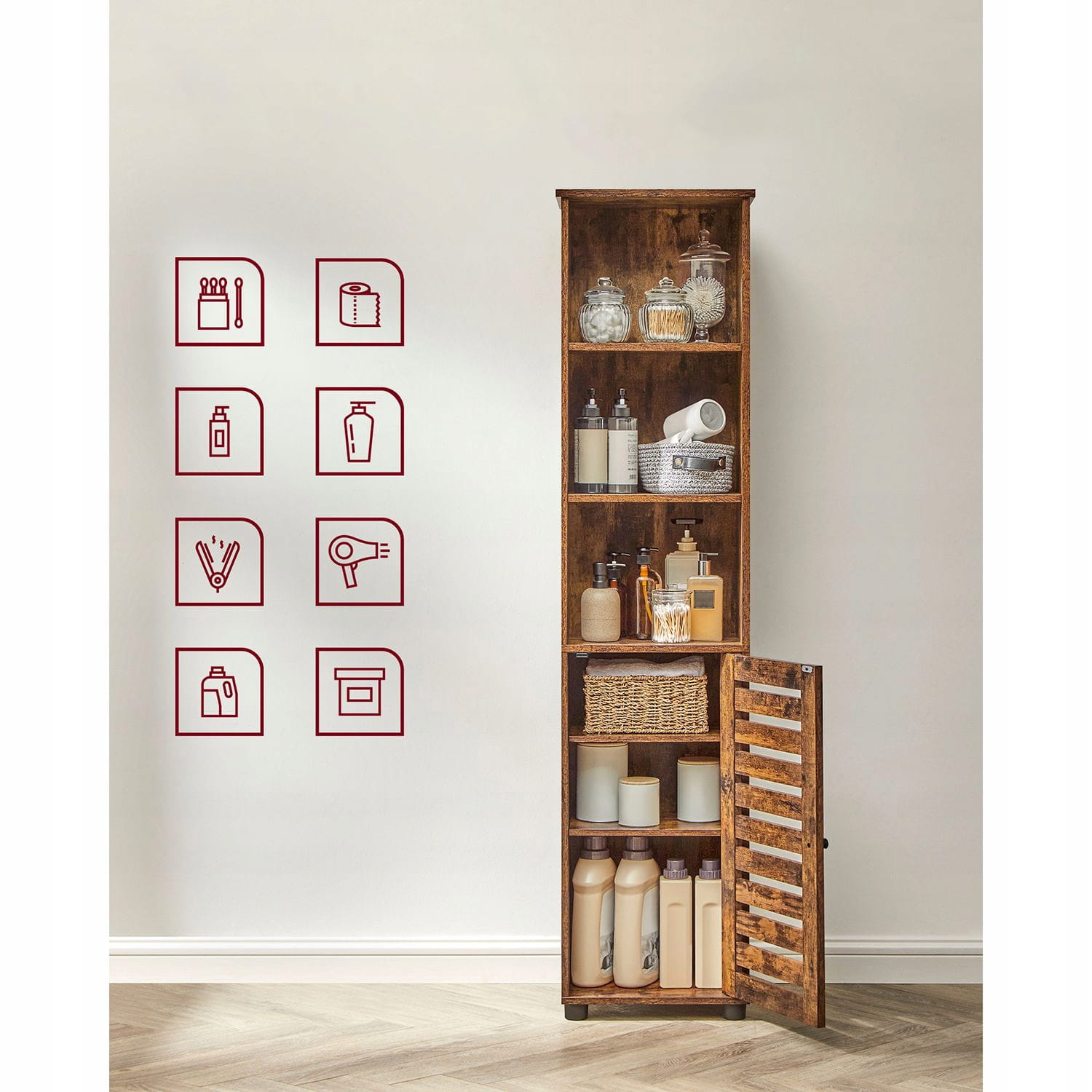 Szafka ta wyposażona jest w trzy otwarte półki oraz dwie regulowane półki za drzwiami, dzięki czemu z łatwością uporządkujesz kosmetyki, ręczniki oraz inne akcesoria łazienkowe.